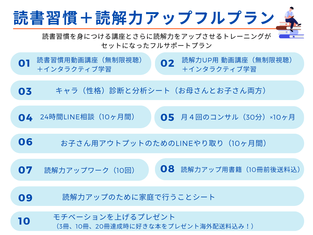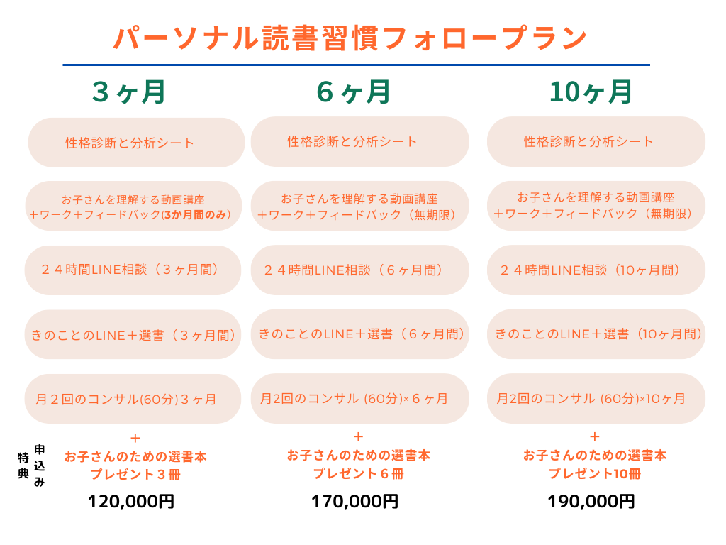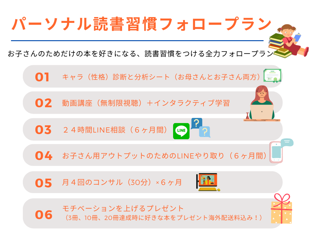 「パーソナル読書習慣フォロープラン」お申し込みの方は1ヶ月または「読書習慣+読解力アップフルプラン」のお申し込みの方は3ヶ月のサービスの延長があります。